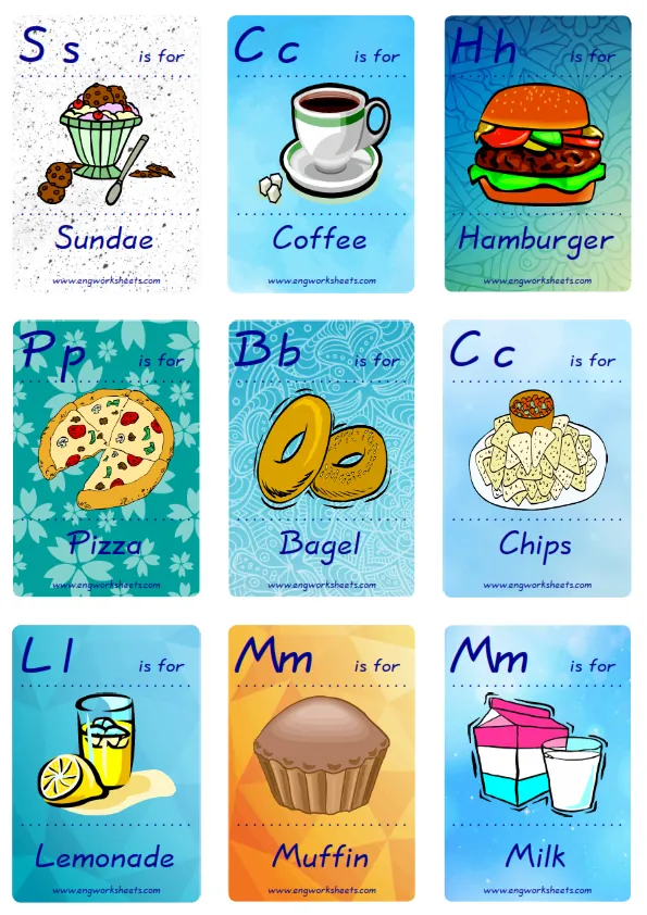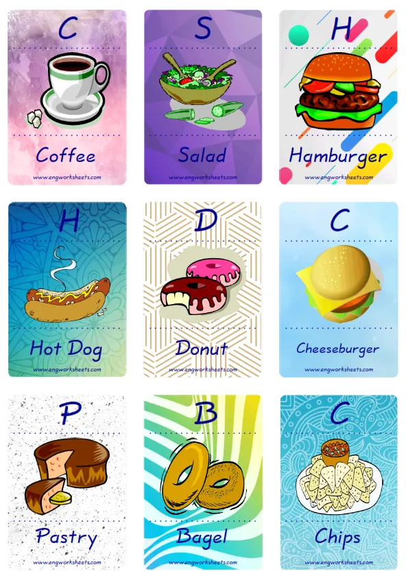 You can always keep the mini enjoyable Fast Food flashcards around you, and study in everywhere. You can play with your friends and your teacher reciprocatively. Nine picture were jointly provided on one page.