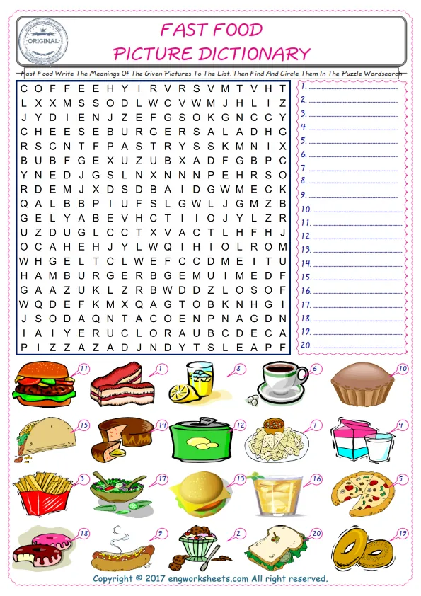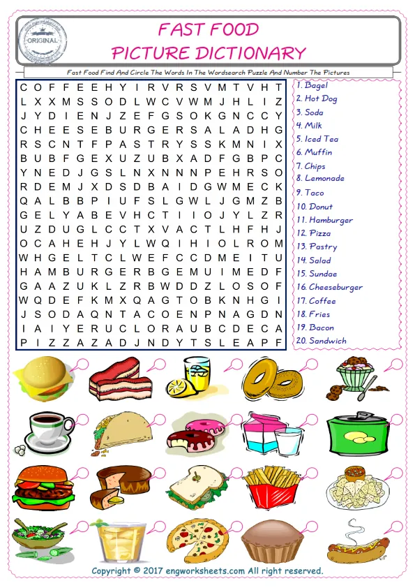 Fast Food words for kids and teachers, ESL printable wordsearch worksheets in order to learn and practice the Fast Food vocabulary. Read the words of Fast Food , find the words in the wordsearch , write its number on the picture; a fun activity for kids. An effective, practical and fun method in order to learn Fast Food words.