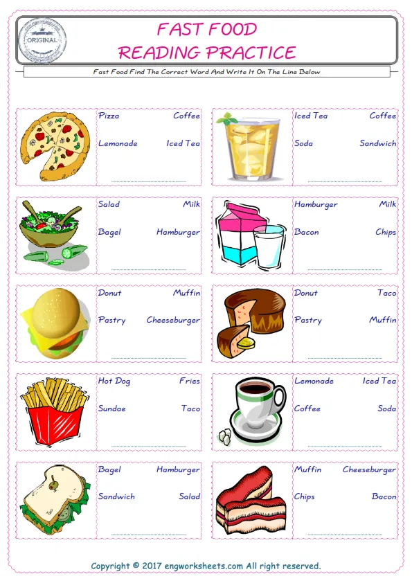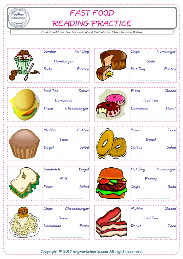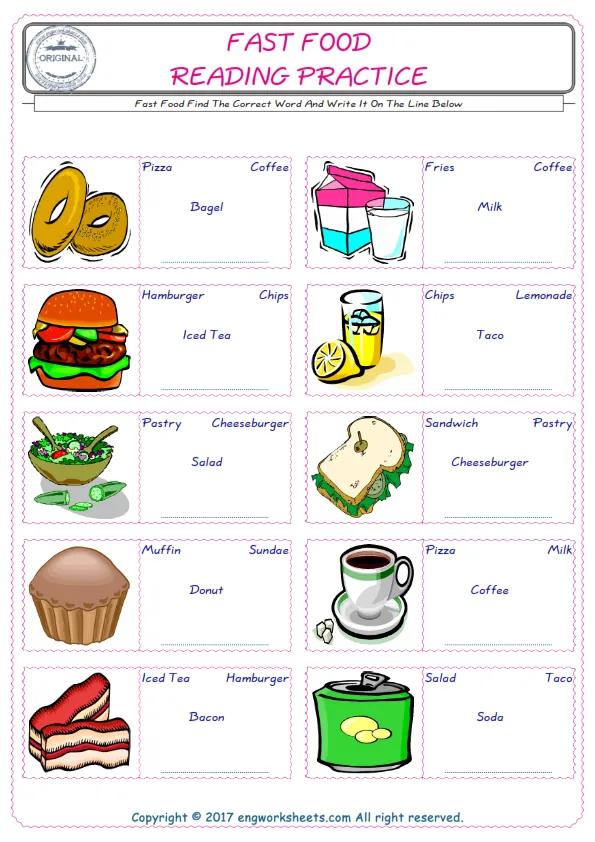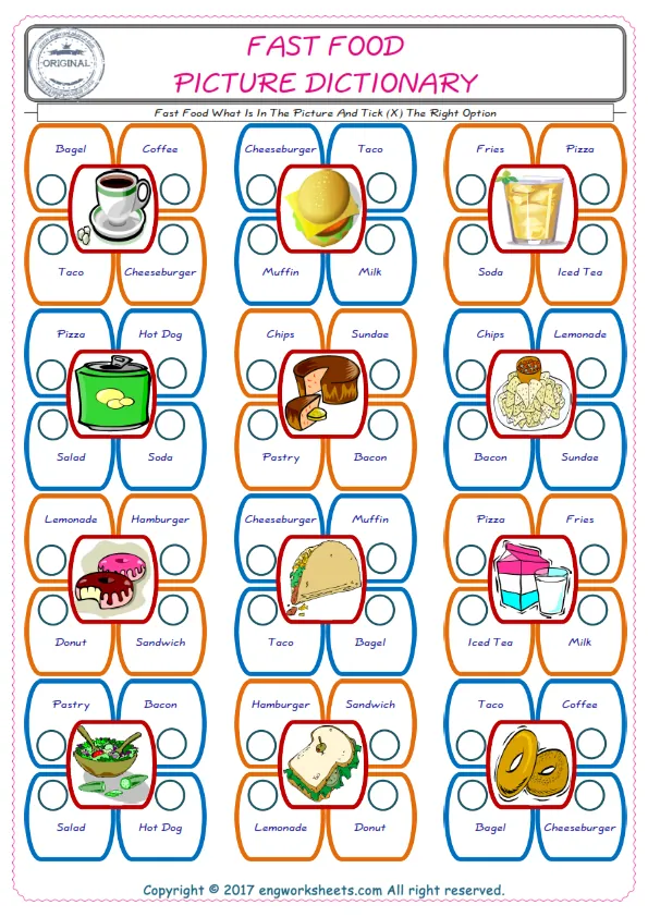 Fast Food English worksheets for kids and teachers special to learning Fast Food words. Fast Food ESL picture dictionary worksheets to improve vocabulary. Fast Food poster works to hang in your classroom. Check the picture and review the words and learn swiftly. By matching the words and pictures, you can make learning both fun and permanent. Our worksheets are very easy, convenient and fun in order to teach and learn the Fast Food words. Each of English worksheets you created is different to each other.