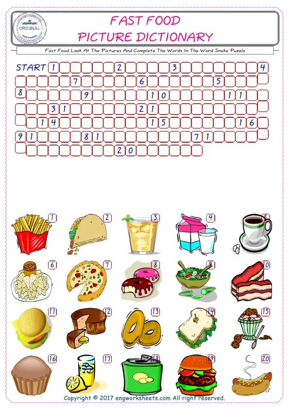 Printable ESL word snake puzzle activity and worksheets for kids and students. Check the English printable worksheets and also the picture of Fast Food ; find the words and type in the boxes on the word snake puzzle. This simple method is quite effective and fun for learning and teaching vocabulary for kids . Teaching and learning of the Fast Food words are very easy thanks to our practical and several worksheets.