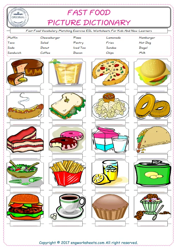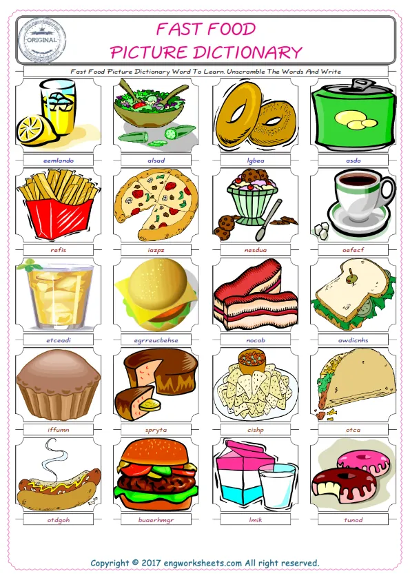 Fast Food English worksheets for kids. Fast Food ESL picture dictionary worksheets to learn words. Check the list at the top of the page and type the names of the Fast Food into the correct boxes. Our worksheets were prepared carefully to learn the Fast Food words. Each of Fast Food ESL worksheets you have created is unique.