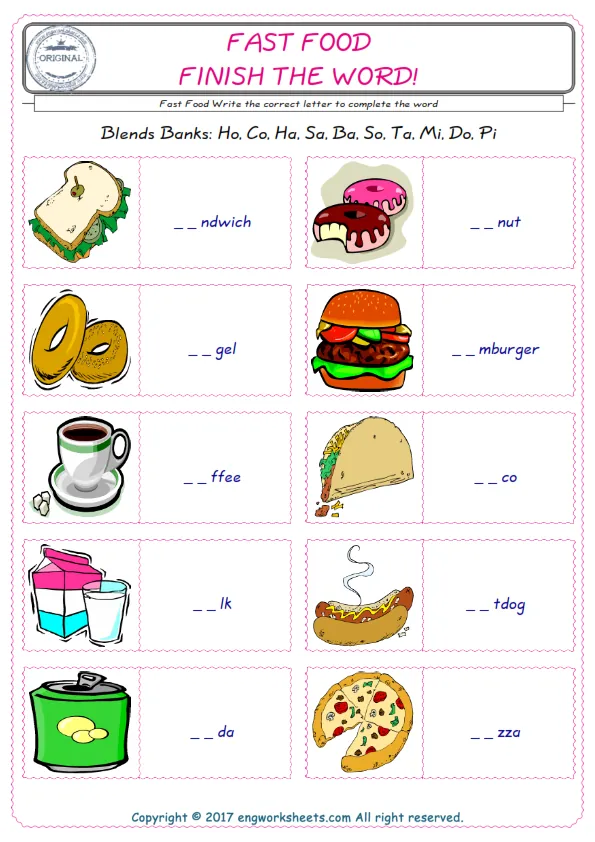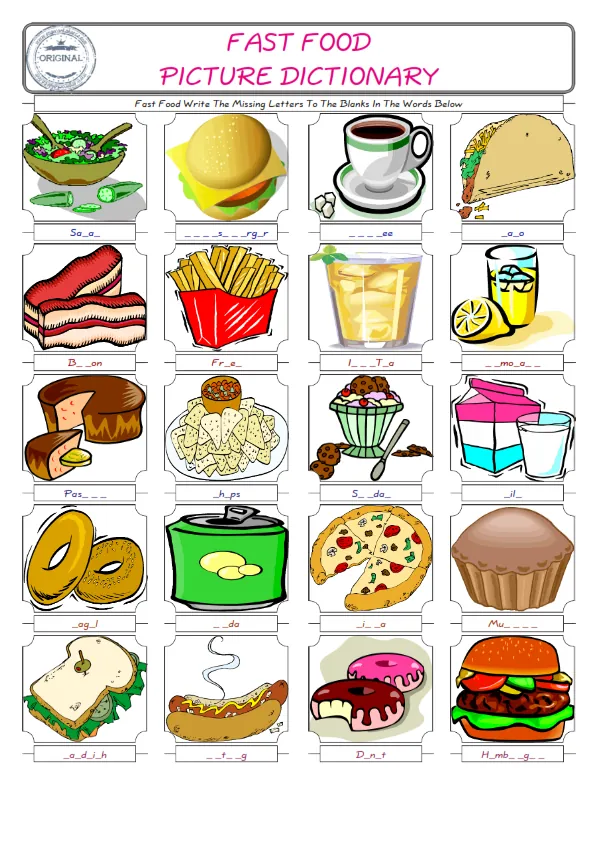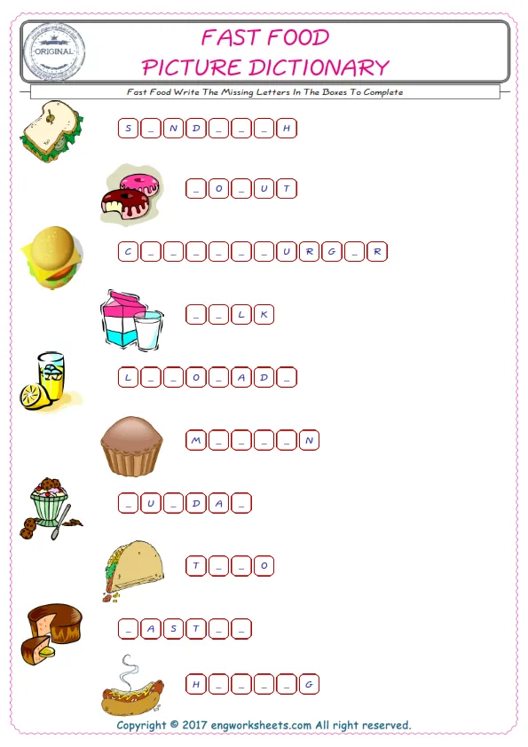 Fast Food vocabulary for kids and teachers Our English worksheets are a bundle of fun to improve and practice. Check the ESL printable worksheets and also the picture of Fast Food find their names and fill the missing letters in the boxes. It is an attentive, improving and fine activity. Our unique and several worksheets wait for you; don't waste your time. Don’t stop, look alive!