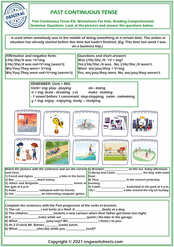 Past Continuous Tense Worksheets For Kids Past Continuous Tense Worksheets For Kids. The Past Continuous Tense, Also Known As The Past Progressive Tense, Refers To A Continuing Action Or State That Was Happening At Some Point In The Past. The Past Continuous Tense Is Formed By Combining The Past Tense Of To Be I.e., Was/were With The Verb’S Present Participle -Ing Word. There Are Many Situations In Which This Verb Tense Might Be Used In A Sentence. For Example, It Is Often Used To Describe Conditions That Existed In The Past. Past Continuous Exercise, Past Continuous Tense Esl Worksheets, English Exercises, Reading Comprehension Grammar Questions, English Grammar Studies, Multiple Choice Questions, Writing And Speaking Activities, Gap Fill And Matching Exercises, Esl Printable Grammar Games, English Language Teaching Resources, English Grammar, Past Continuous Tense, Past Continuous Tense Examples.