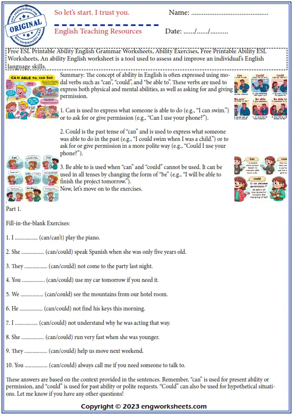 Free ESL Printable Ability English Grammar Worksheets and Exercises