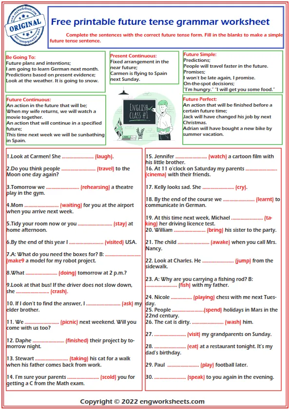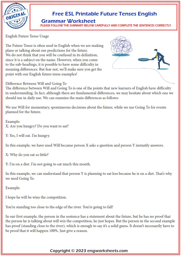 Free ESL Printable Future Tenses English Grammar Worksheets and Exercises