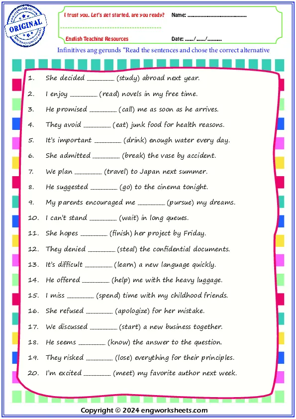 "Want to learn or teach infinitives and gerunds in English grammar? Our free, printable ESL (English as a Second Language) grammar worksheet will help students learn and practice these complex topics step by step! The worksheet features interactive exercises filled with fill in the blanks, sentence completions, and real-life examples. For teachers, it's an ideal resource to use in classroom activities or as homework. Download, print, and practice your language skills now! Designed for easy access and use, in PDF format. Infinitives and gerunds made easier to understand!" Infinitives and gerunds exercises Free ESL grammar worksheets. Printable English grammar PDF. Infinitives vs gerunds rules. ESL infinitives gerunds practice.