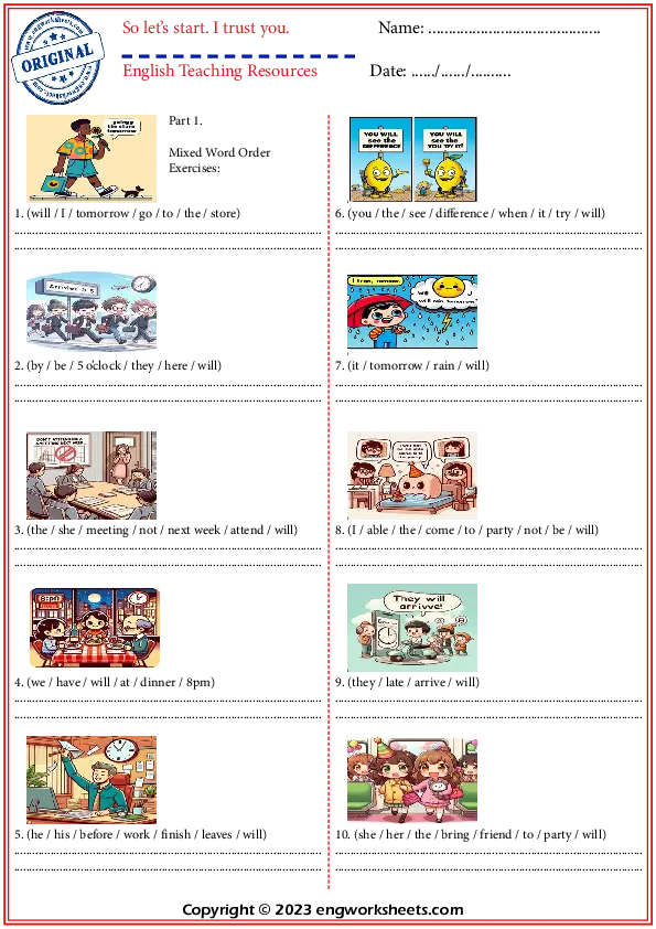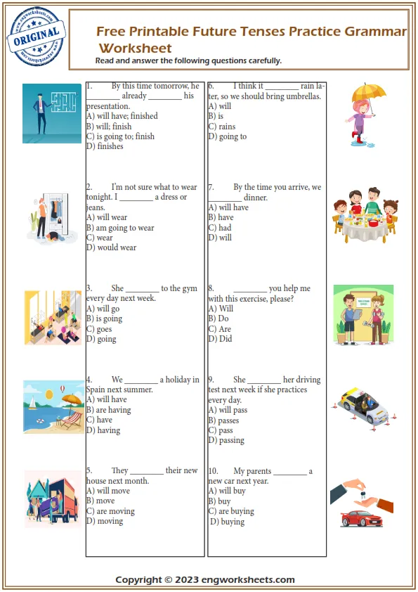Enhance your English learning with our "Free ESL Printable Future Tenses English Grammar Worksheets and Exercises". These comprehensive worksheets are tailored for ESL students, focusing on mastering future tenses. Perfect for both classroom use and self-study, our high-quality, printable exercises are designed to improve grammar skills and boost confidence in using future tenses. Download now and make learning fun and effective with engaging activities that reinforce key concepts. Ideal for teachers and students alike, our worksheets are an essential resource for achieving fluency in future tenses. Get your free copy today and start your journey to perfect grammar! Keywords: Free ESL Printable Future Tenses Worksheets, English Grammar Future Tenses Worksheets, ESL Future Tenses Exercises, Printable Grammar Exercises, Future Tenses Practice for ESL Students Search Phrases: Free ESL future tenses worksheets, Printable English grammar worksheets for future tenses, Future tenses exercises for ESL learners, Download free ESL future tenses worksheets, Best ESL printable resources for future tenses