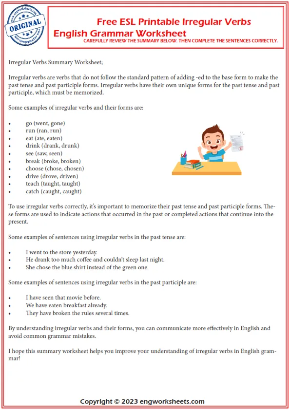 "mastering Irregular Verbs: A Comprehensive Guide To Improve Your English Language Skills" This Subject Description Includes The Keyword "irregular Verbs" Which Is Important For Seo Purposes. It Also Uses Action-Oriented Language With The Verb "mastering" And Emphasizes The Benefit Of Improving English Language Skills. The Phrase "comprehensive Guide" Suggests That The Content Is Thorough And Covers A Wide Range Of Topics Related To Irregular Verbs. Irregular Verbs Grammar Worksheet, Free Esl Printable Irregular Verbs English Grammar Worksheet, Grammar Worksheets.