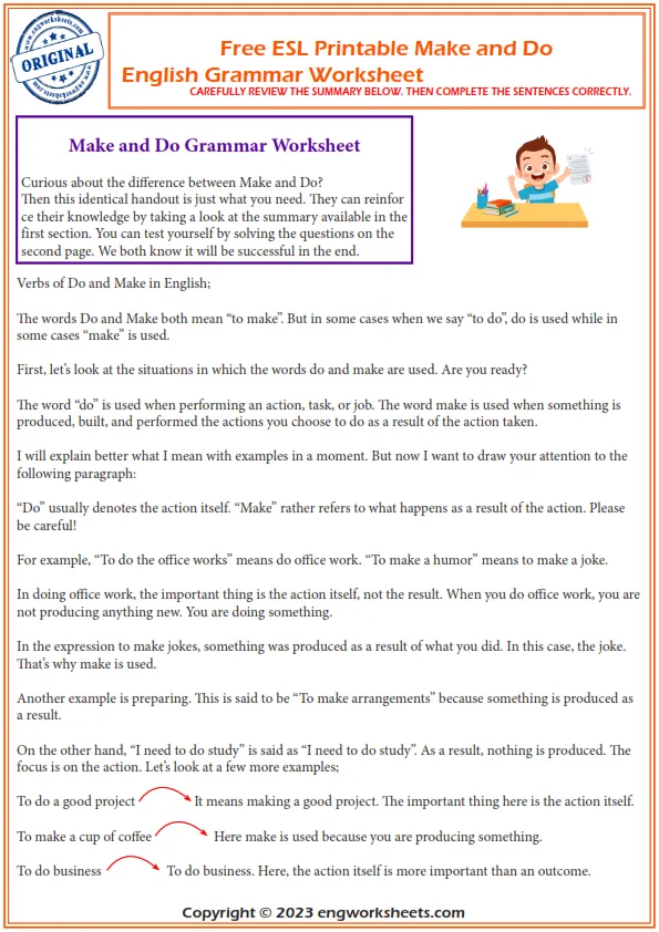 Free Esl Printable Make And Do Esl English Grammar Worksheet