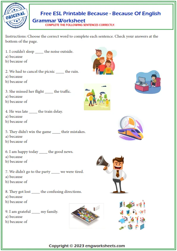 Free Esl Printable Because And Because Of English Grammar Worksheet
