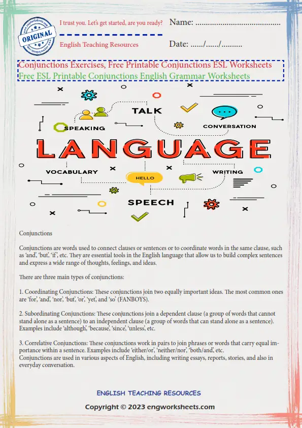 Unlock the power of language with our "Free ESL Printable Conjunctions English Grammar Worksheets". Perfect for ESL students, these worksheets cover essential conjunctions, helping learners master English grammar effortlessly. Ideal for classroom use or self-study, our high-quality, printable materials are designed to boost understanding and fluency. Download now to enhance your lessons with engaging exercises that reinforce key concepts. Whether you're a teacher or a student, our comprehensive worksheets are a valuable resource for mastering conjunctions. Get your free copy today and take the first step towards impeccable grammar! Keywords: Free ESL Printable Conjunctions Worksheets, English Grammar Worksheets, ESL Grammar Exercises, Printable Grammar Sheets, Conjunctions Practice for ESL Students Search Phrases: Free ESL conjunctions worksheets, Printable English grammar worksheets for ESL, Conjunctions exercises for ESL learners, Download free ESL grammar worksheets, Best ESL printable resources for conjunctions