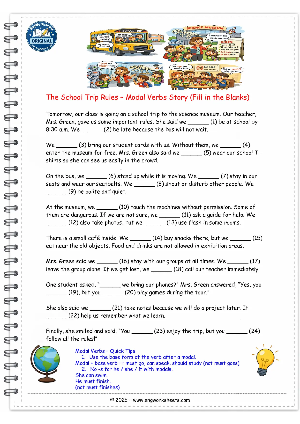 Practice modal verbs with a story-based worksheet and a 20-question multiple choice test. This printable ESL resource helps students learn can, must, should, have to, may, and might through contextual reading and rule-based questions. Ideal for classroom use and homework, the activity improves grammar accuracy and modal verb usage step by step. Modal verbs exercises, modal verbs worksheet, modal verbs test, modal verbs story, can must should exercises, ESL modal verbs practice, modal verbs multiple choice, modal verbs fill in the blanks, printable grammar worksheet, modal verbs quiz, English modal verbs activities, modal verbs PDF worksheet