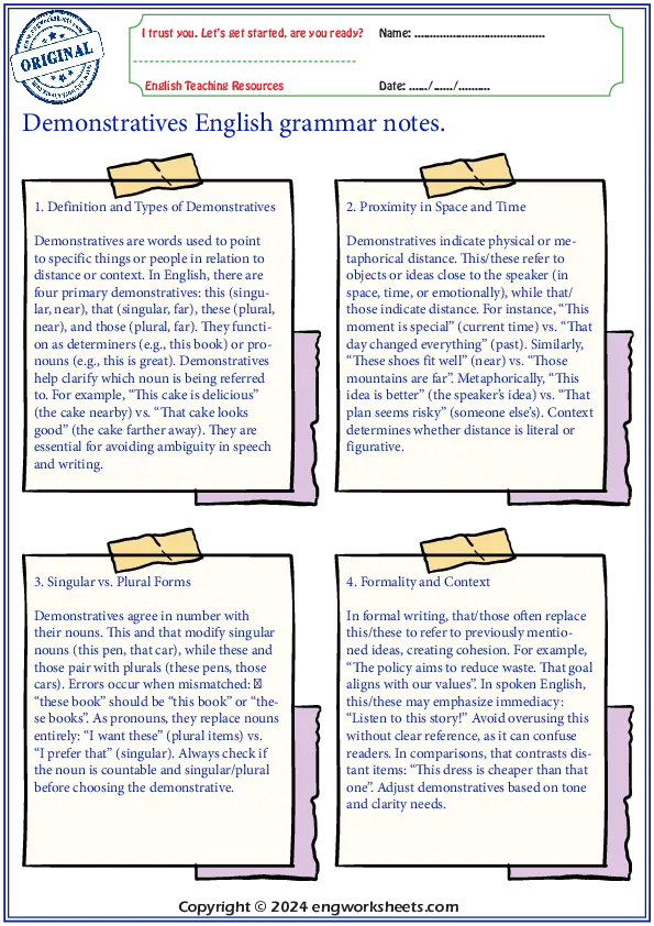 Free Printable Demonstratives ESL Worksheets – Boost Grammar Skills Effortlessly! Looking for free printable demonstratives ESL worksheets to teach "this, that, these, those" effectively? Our carefully designed worksheets help students master demonstratives through engaging exercises, perfect for classroom or self-study. These printable resources include fill-in-the-blanks, matching activities, and sentence creation tasks, tailored for beginners to intermediate learners. Ideal for ESL teachers and tutors, these no-cost worksheets save preparation time while offering clear examples and visual aids to reinforce grammar concepts. Whether focusing on spoken or written English, the materials provide structured practice to build confidence. Download instantly in PDF format for hassle-free printing! Each worksheet is SEO-optimized with keywords like "demonstratives ESL practice" and "free grammar printables" to help educators find quality content quickly. Enhance your lessons with interactive, easy-to-use resources that make learning demonstratives fun and effective.