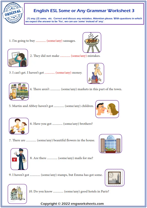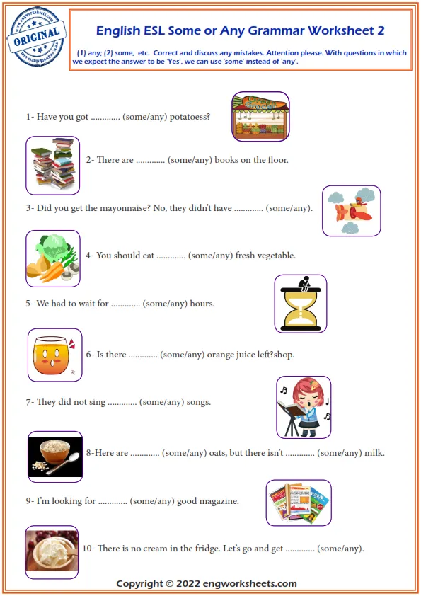 We Use Some And Any With Plural And Uncountable Nouns. Some Is Often Used In Affirmative Sentences. Any Is Often Used In Negative Sentences. 1 Any; 2 Some, Etc. Correct And Discuss Any Mistakes. Attention Please. With Questions In Which We Expect The Answer To Be ‘Yes’, We Can Use ‘Some’ Instead Of ‘Any’. You Can Use The Worksheet On The Smart Board Or Download It As A Free Pdf. Some Or Any Exercise. Some Or Any Grammar Worksheet. Some Or Any. Some Or Any Worksheets.