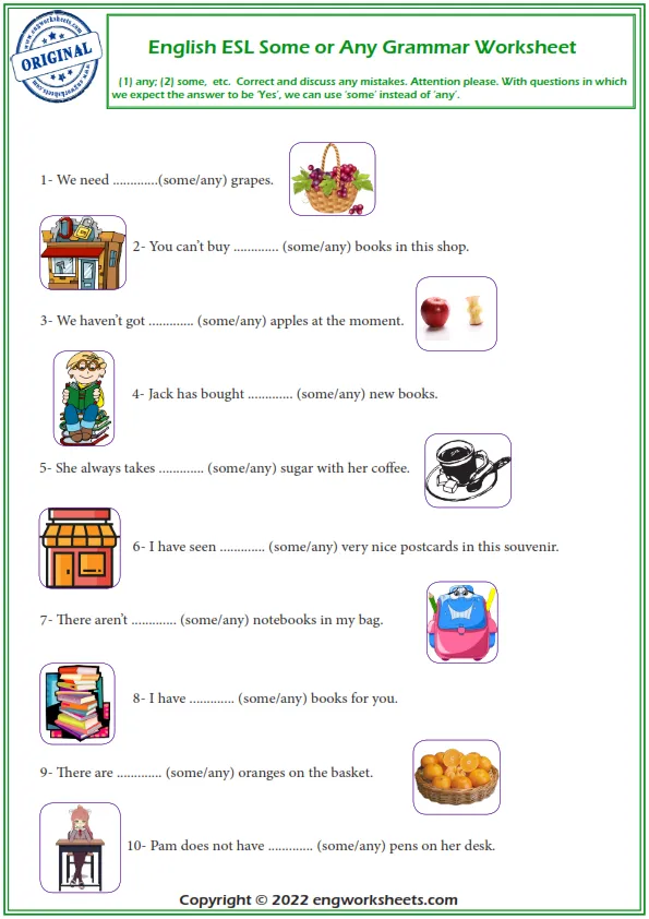 The Main Difference Between Some And Any. As A General Rule, We Use 'some' For Affirmative Sentences And 'any' For Questions Or Negative Sentences. Generally, Both 'some' And 'any' Can Only Be Used With Countable Plural Nouns Or Uncountable Nouns. A Worksheet Of English Esl Some Or Any Worksheets For Home Learning, Online Practice, Distance Learning And English Classes To Teach About. Some Or Any Online Worksheet For Elementary. You Can Use The Worksheet On The Smart Board Or Download It As A Free Pdf. Some Or Any Exercise. Some Or Any Grammar Worksheet. Some Or Any. Some Or Any Worksheets.