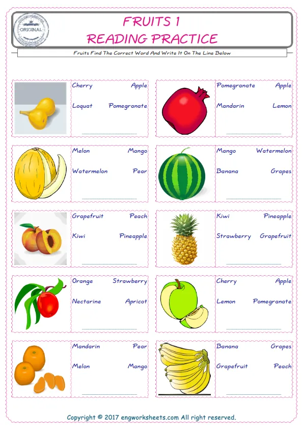 Fruits English worksheets for kids and teachers special to learning Fruits words. Fruits ESL picture dictionary worksheets to improve vocabulary. Fruits poster works to hang in your classroom. Check the picture and review the words and learn swiftly. By matching the words and pictures, you can make learning both fun and permanent. Our worksheets are very easy, convenient and fun in order to teach and learn the Fruits words. Each of English worksheets you created is different to each other.