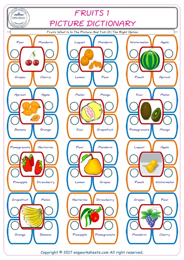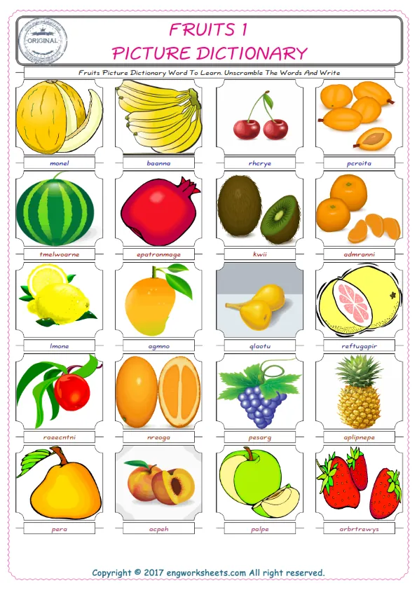 Fruits English Worksheet for Kids ESL Printable Picture Dictionary