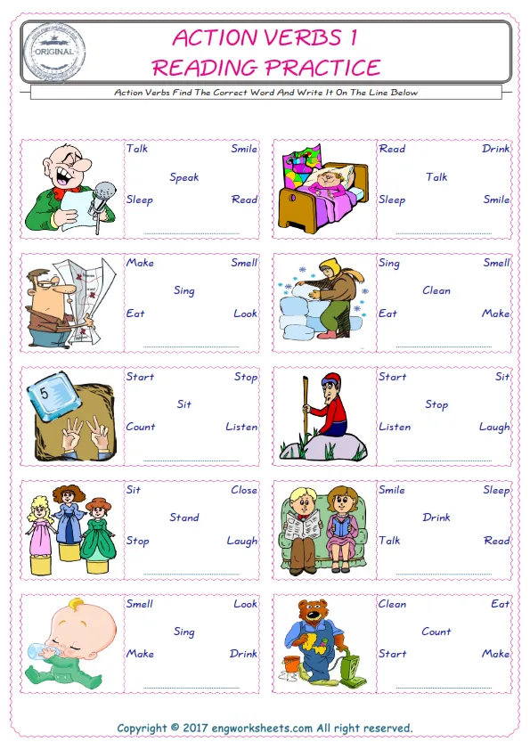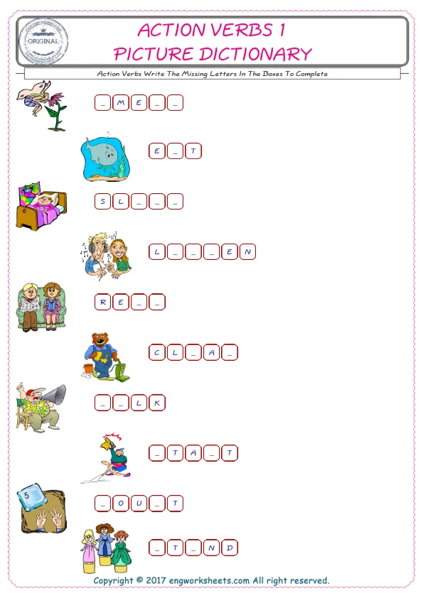 Action Verbs English worksheets for kids and teachers special to learning Action Verbs words. Action Verbs ESL picture dictionary worksheets to improve vocabulary. Action Verbs poster works to hang in your classroom. Check the picture and review the words and learn swiftly. By matching the words and pictures, you can make learning both fun and permanent. Our worksheets are very easy, convenient and fun in order to teach and learn the Action Verbs words. Each of English worksheets you created is different to each other.