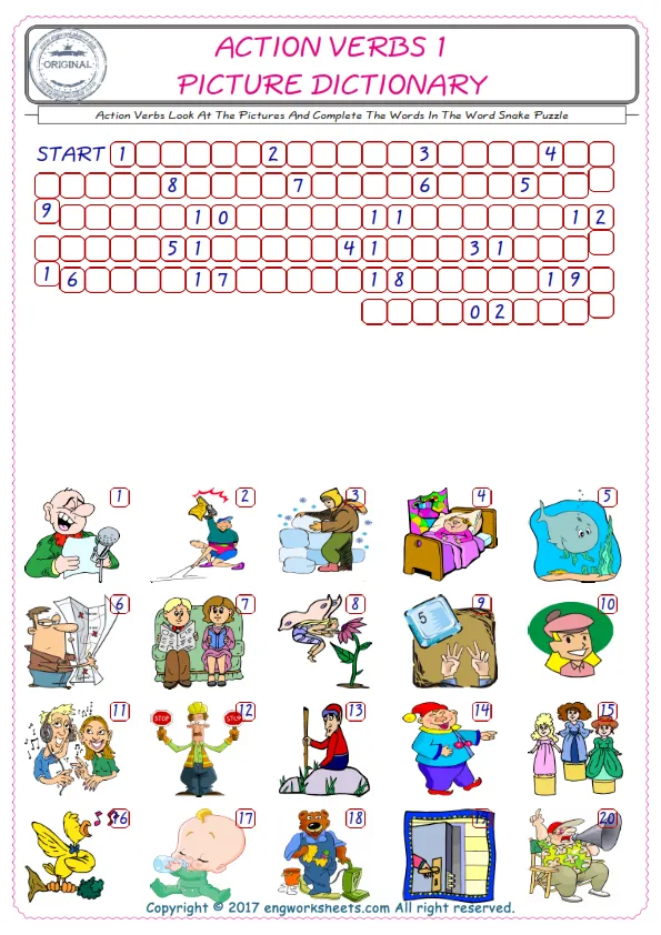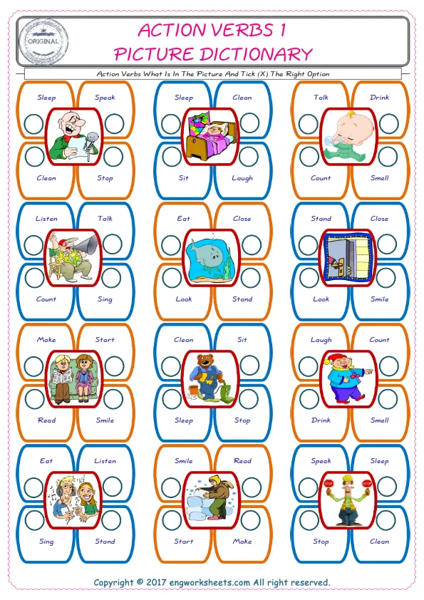 Action Verbs English Worksheet for Kids ESL Printable Picture Dictionary