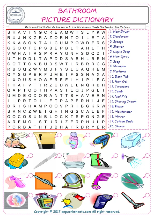 Bathroom English worksheets for kids and teachers special to learning Bathroom words. Bathroom ESL picture dictionary worksheets to improve vocabulary. Bathroom poster works to hang in your classroom. Check the picture and review the words and learn swiftly. By matching the words and pictures, you can make learning both fun and permanent. Our worksheets are very easy, convenient and fun in order to teach and learn the Bathroom words. Each of English worksheets you created is different to each other.