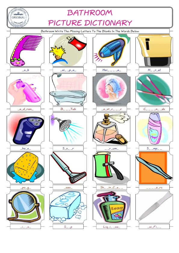 Bathroom English Worksheet for Kids ESL Printable Picture Dictionary