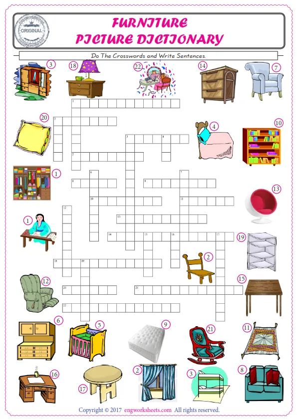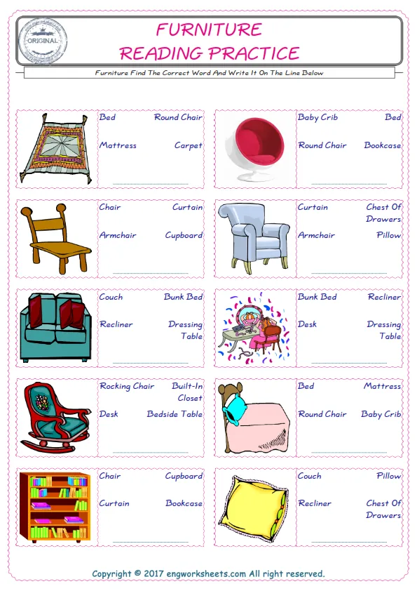 Furniture English worksheets for kids and teachers special to learning Furniture words. Furniture ESL picture dictionary worksheets to improve vocabulary. Furniture poster works to hang in your classroom. Check the picture and review the words and learn swiftly. By matching the words and pictures, you can make learning both fun and permanent. Our worksheets are very easy, convenient and fun in order to teach and learn the Furniture words. Each of English worksheets you created is different to each other.
