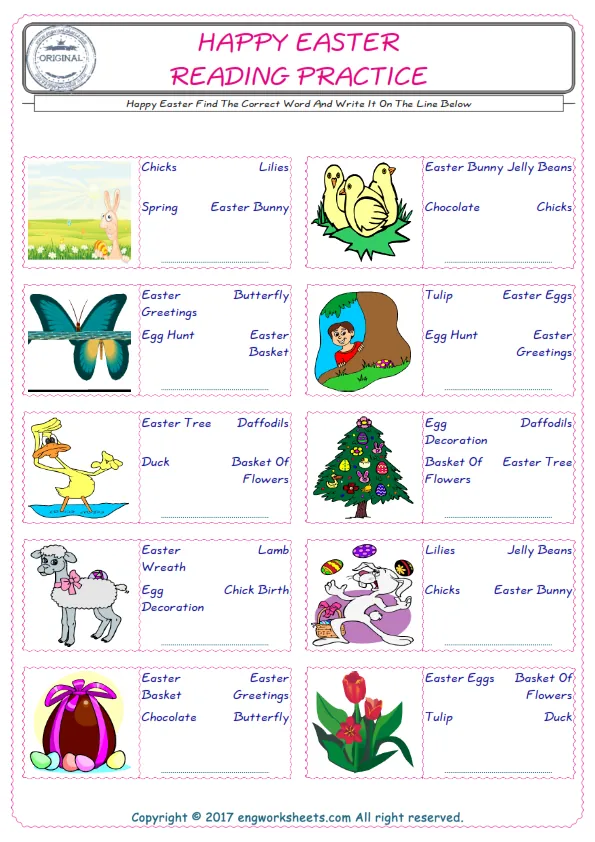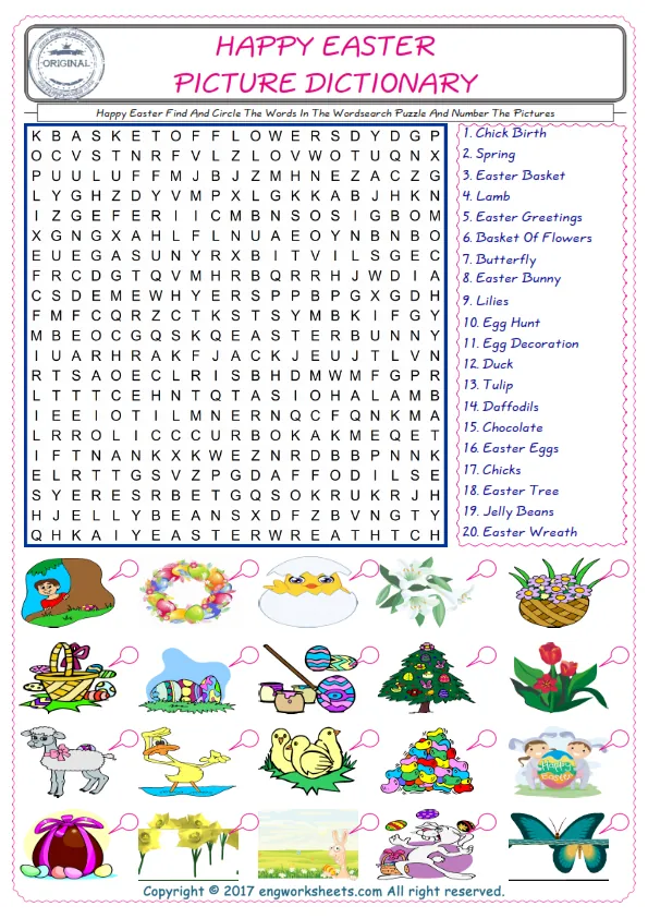 Happy Easter English worksheets for kids and teachers special to learning Happy Easter words. Happy Easter ESL picture dictionary worksheets to improve vocabulary. Happy Easter poster works to hang in your classroom. Check the picture and review the words and learn swiftly. By matching the words and pictures, you can make learning both fun and permanent. Our worksheets are very easy, convenient and fun in order to teach and learn the Happy Easter words. Each of English worksheets you created is different to each other.