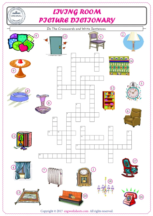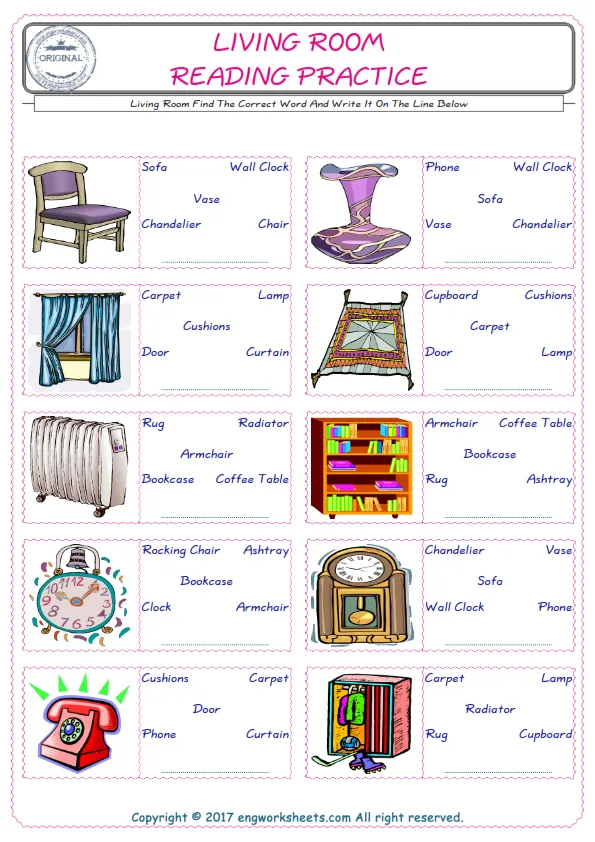Living Room English worksheets for kids and teachers special to learning Living Room words. Living Room ESL picture dictionary worksheets to improve vocabulary. Living Room poster works to hang in your classroom. Check the picture and review the words and learn swiftly. By matching the words and pictures, you can make learning both fun and permanent. Our worksheets are very easy, convenient and fun in order to teach and learn the Living Room words. Each of English worksheets you created is different to each other.