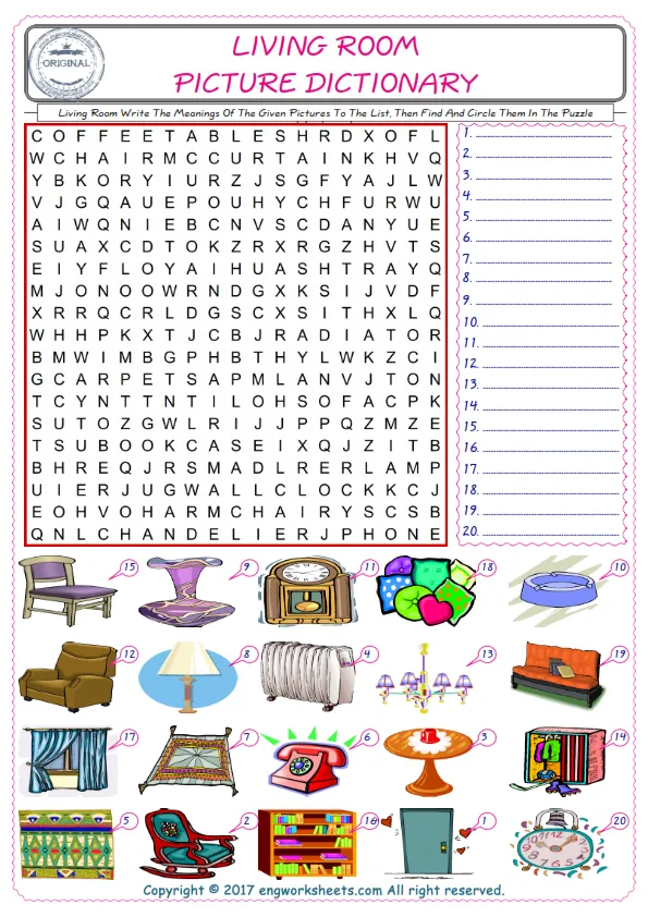 Living Room English Worksheet for Kids ESL Printable Picture Dictionary