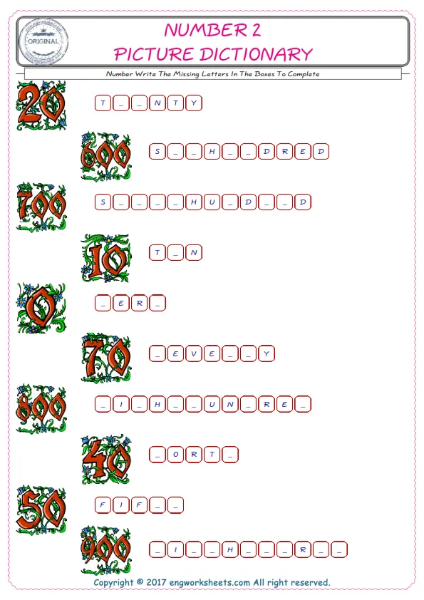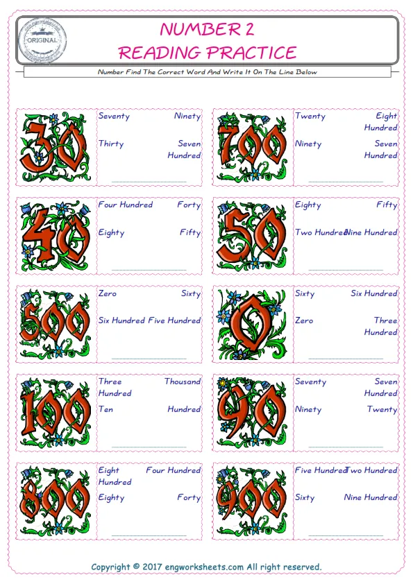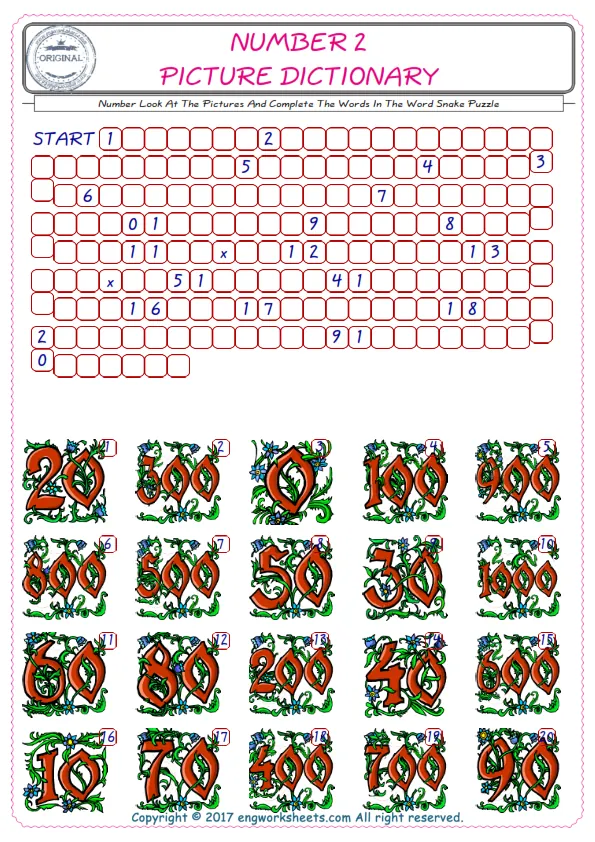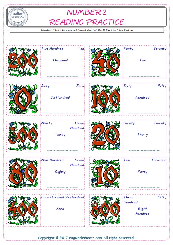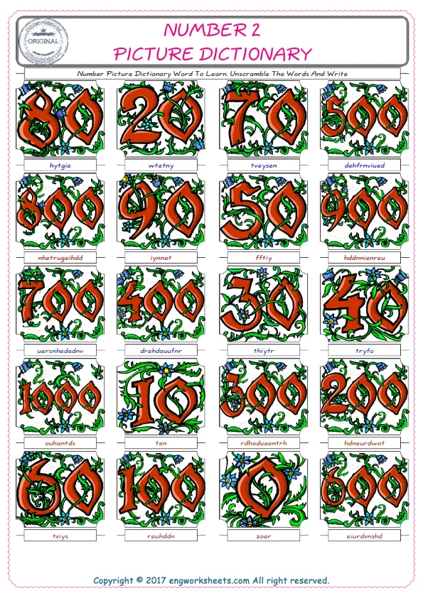 Number English worksheets for kids and teachers special to learning Number words. Number ESL picture dictionary worksheets to improve vocabulary. Number poster works to hang in your classroom. Check the picture and review the words and learn swiftly. By matching the words and pictures, you can make learning both fun and permanent. Our worksheets are very easy, convenient and fun in order to teach and learn the Number words. Each of English worksheets you created is different to each other.