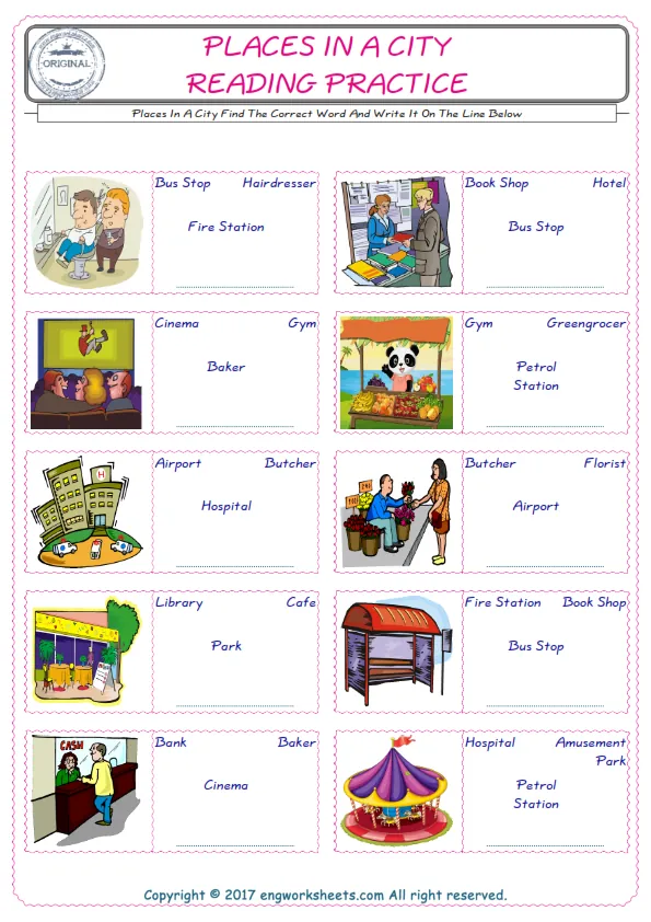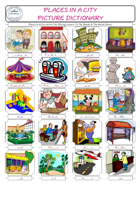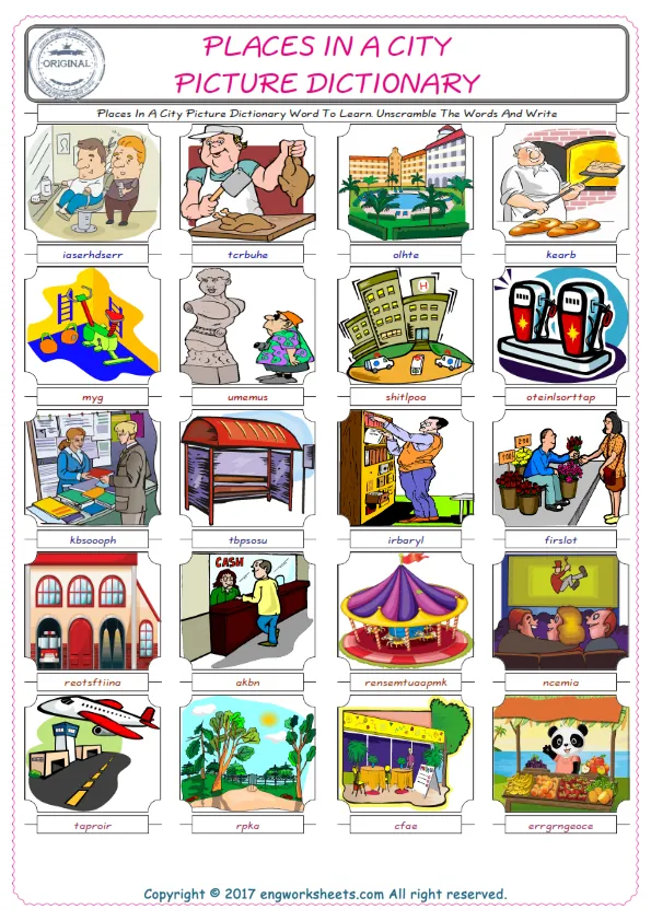 Places In A City English worksheets for kids and teachers special to learning Places In A City words. Places In A City ESL picture dictionary worksheets to improve vocabulary. Places In A City poster works to hang in your classroom. Check the picture and review the words and learn swiftly. By matching the words and pictures, you can make learning both fun and permanent. Our worksheets are very easy, convenient and fun in order to teach and learn the Places In A City words. Each of English worksheets you created is different to each other.