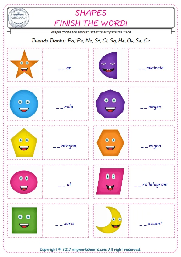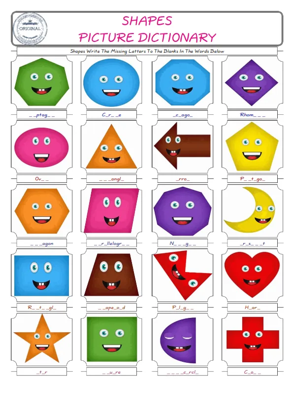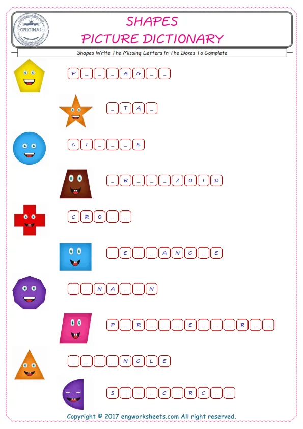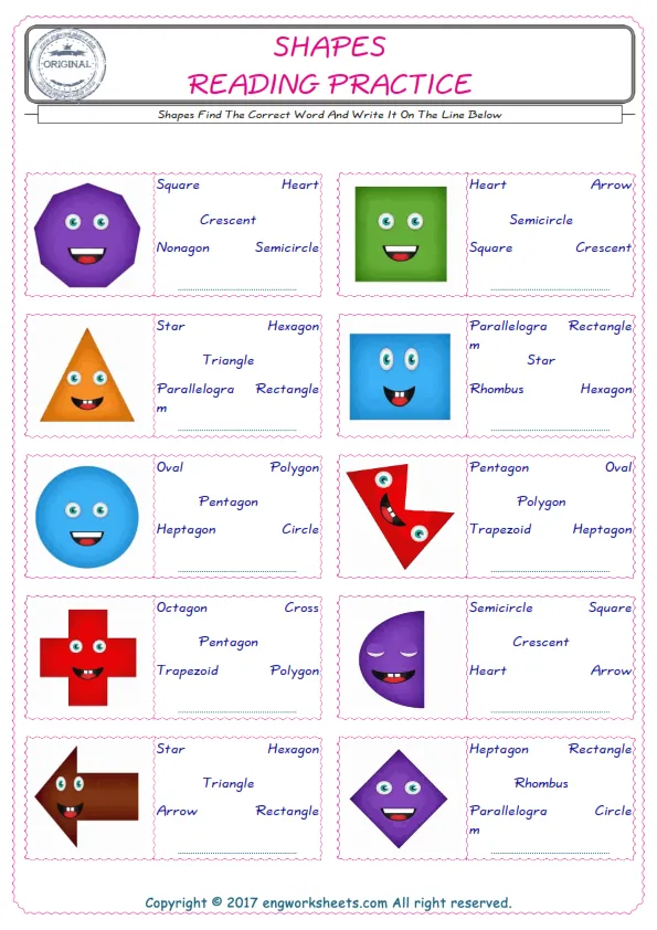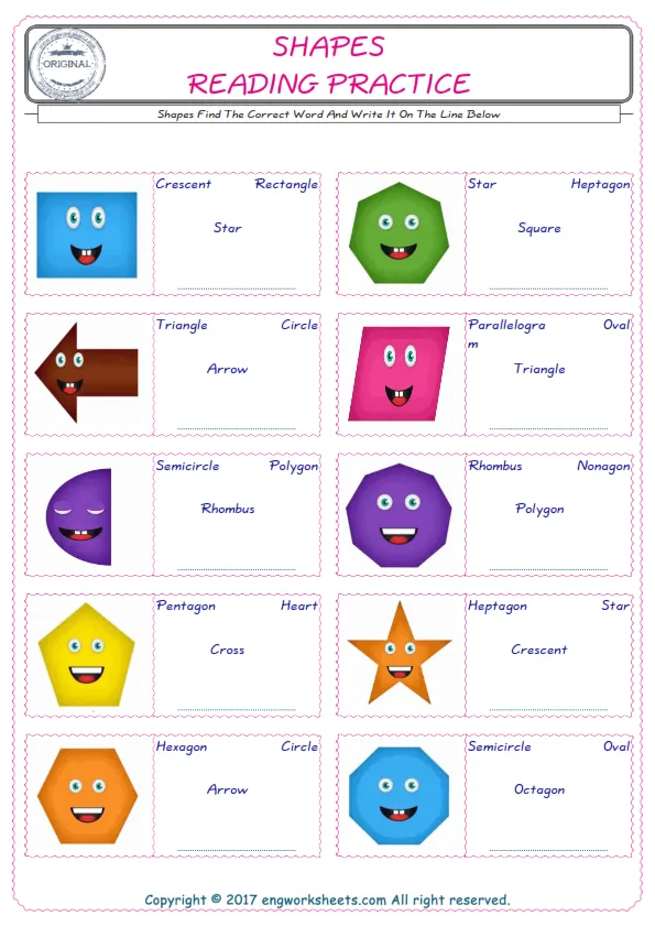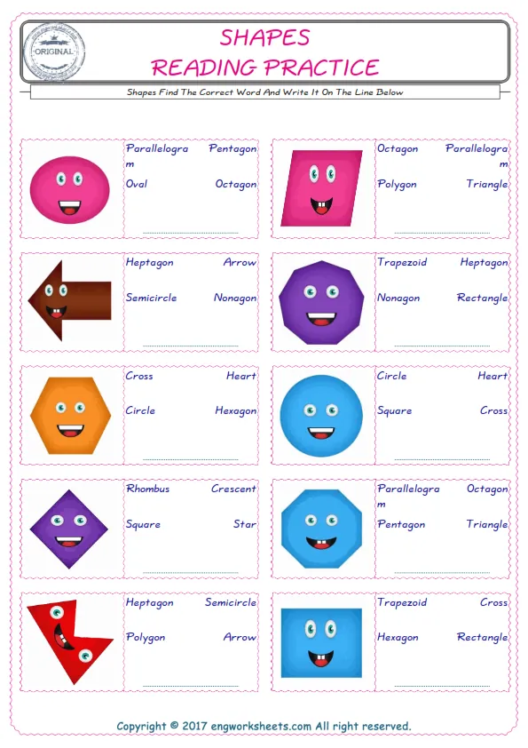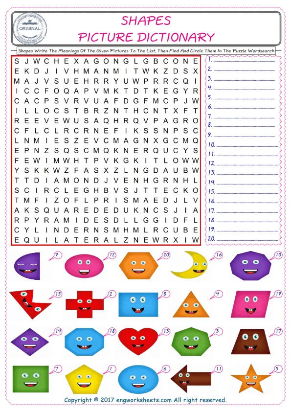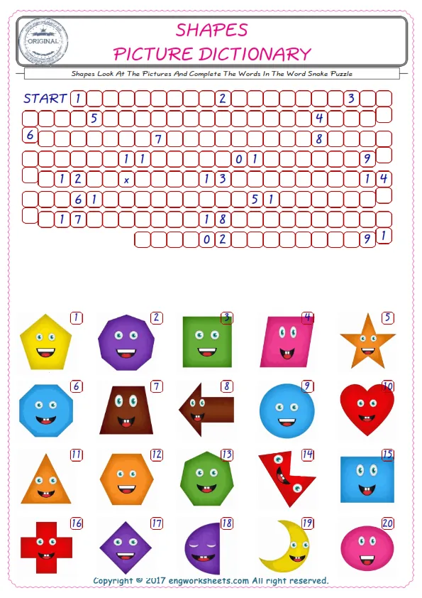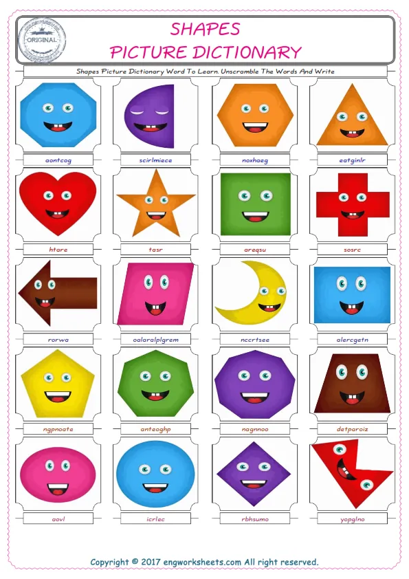 Shapes English worksheets for kids and teachers special to learning Shapes words. Shapes ESL picture dictionary worksheets to improve vocabulary. Shapes poster works to hang in your classroom. Check the picture and review the words and learn swiftly. By matching the words and pictures, you can make learning both fun and permanent. Our worksheets are very easy, convenient and fun in order to teach and learn the Shapes words. Each of English worksheets you created is different to each other.