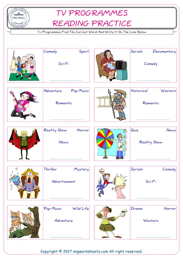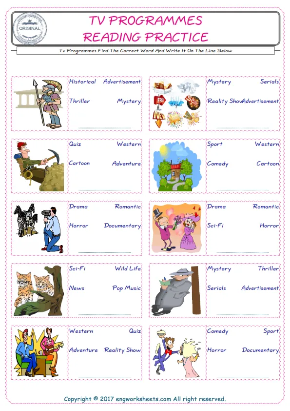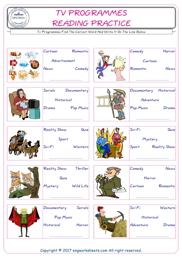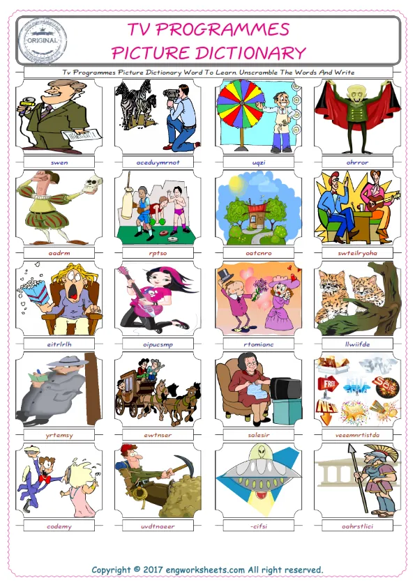 Tv Programmes English worksheets for kids and teachers special to learning Tv Programmes words. Tv Programmes ESL picture dictionary worksheets to improve vocabulary. Tv Programmes poster works to hang in your classroom. Check the picture and review the words and learn swiftly. By matching the words and pictures, you can make learning both fun and permanent. Our worksheets are very easy, convenient and fun in order to teach and learn the Tv Programmes words. Each of English worksheets you created is different to each other.