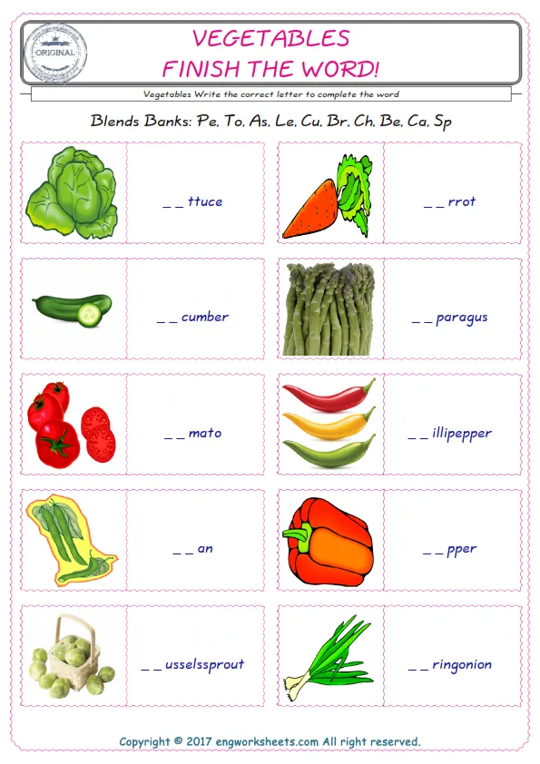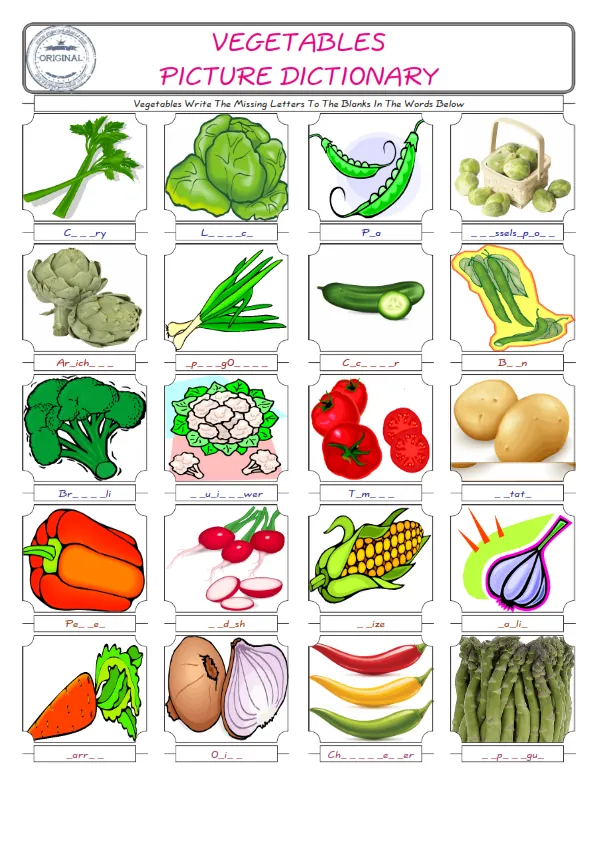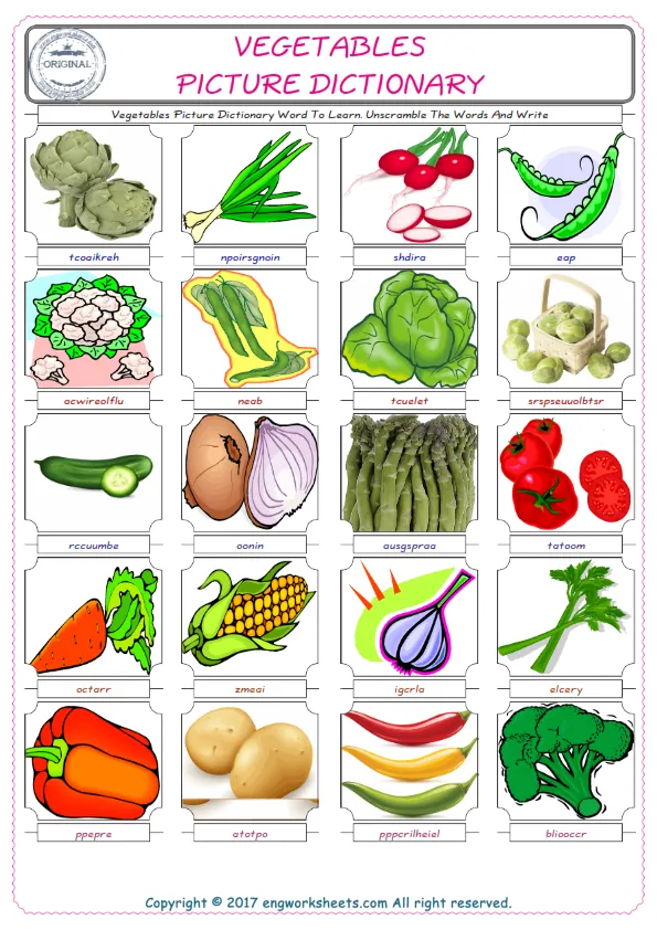 Vegetables English Worksheet for Kids ESL Printable Picture Dictionary