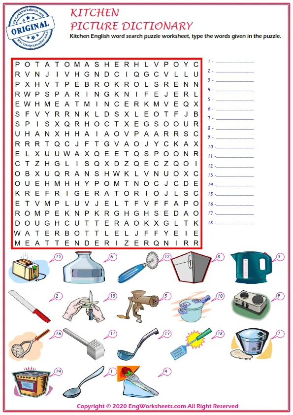 Our word search puzzle worksheet is another fun way to practice kitchen vocabulary. Learners can search for words related to cooking, baking, and kitchen utensils in this engaging activity. The puzzle can be done individually or in pairs, making it a great classroom activity.