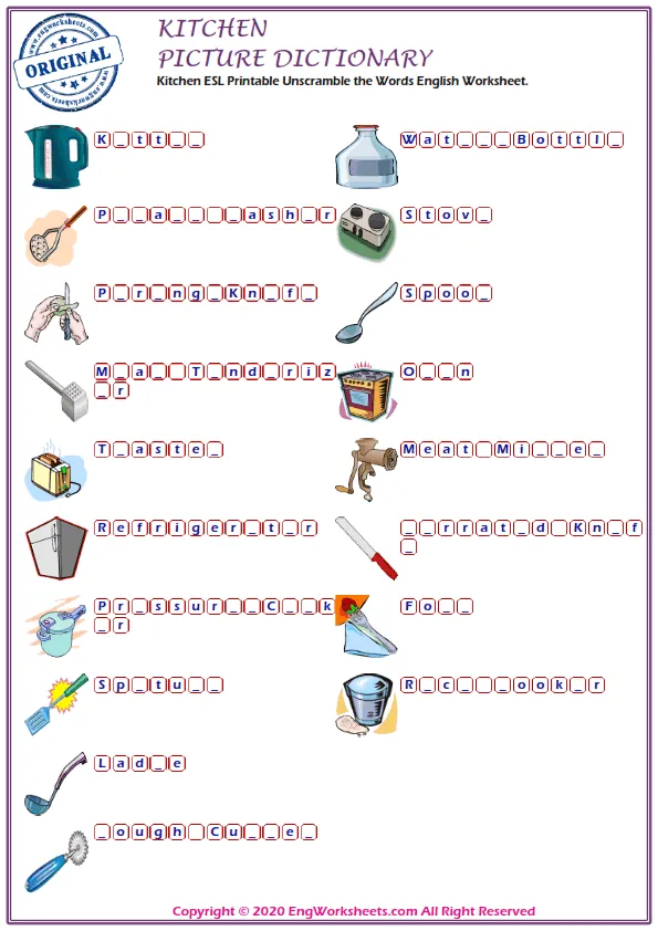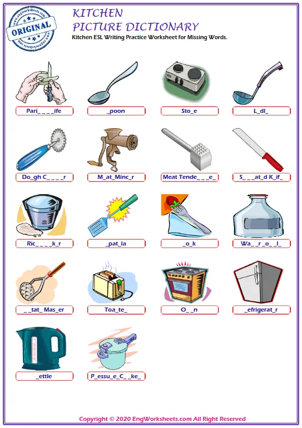 For learners who need extra practice with spelling, the missing English word completion worksheets are a great resource. These worksheets feature kitchen-related sentences with missing words for learners to complete. This activity is a great way to reinforce spelling and comprehension skills.