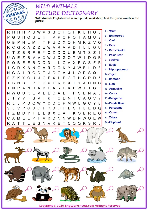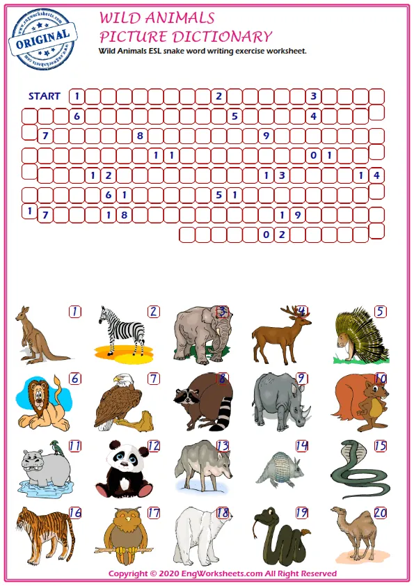 For a more interactive wild animal-related learning experience, try our Word Search Puzzle Worksheet or Word Snake Puzzle Worksheet. These puzzles challenge you to find wild animal-related words hidden within a grid or snake of letters, helping you to improve your vocabulary and spelling skills.