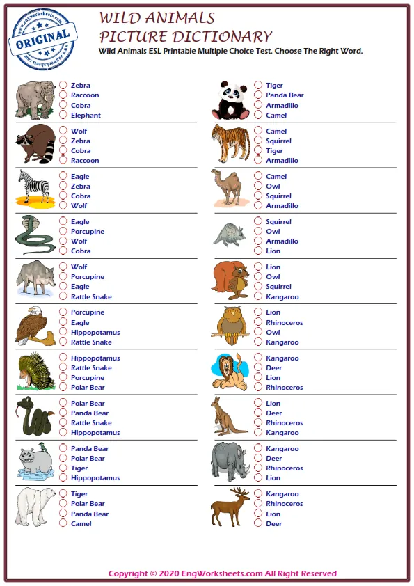 Finally, our Multiple Choice English Tests are a great way to test your wild animal-related vocabulary knowledge in a more formal setting. With a variety of questions and levels, these tests are a great way to assess your progress and identify areas for improvement.