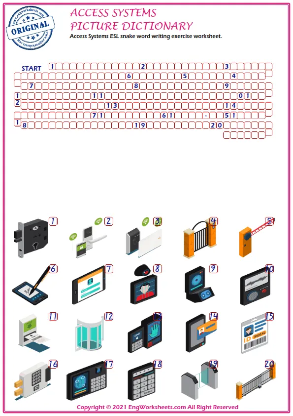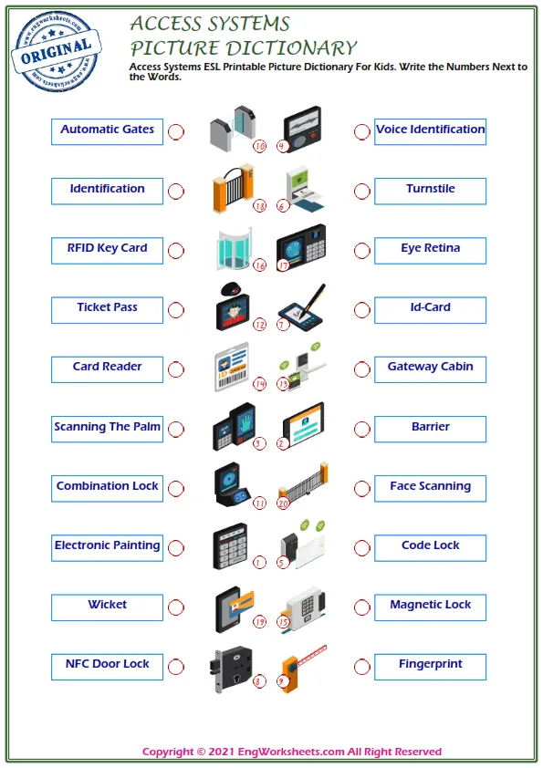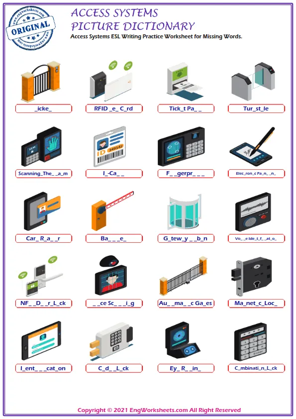 English equivalent is given below the pictures and pictures on our Access Systems English vocabulary worksheet for kids. On this worksheet you will learn the words and pictures you will come across on all of our Access Systems English worksheets. You have to match words and pictures on our Access Systems worksheet and learn the words. You can print our printable Access Systems English worksheets and distribute them to your students.
