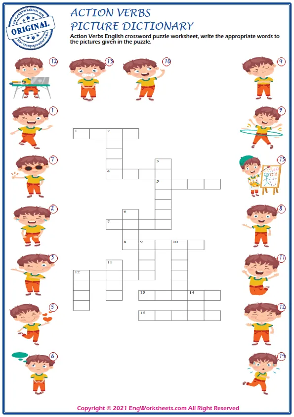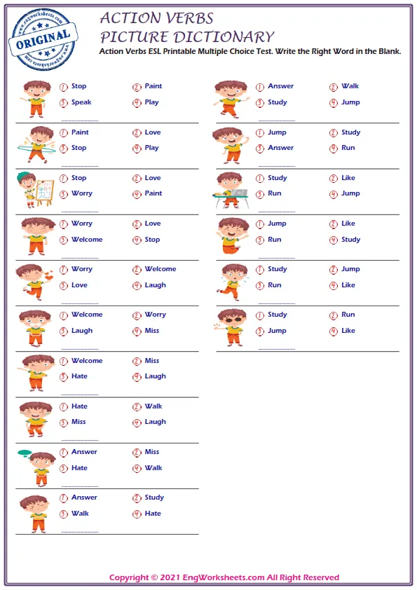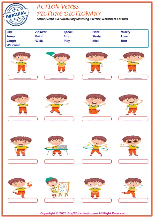 On our worksheet with a different design for kids. It allows you to check whether you learn correctly by writing the Action Verbs words you match with the pictures in the empty boxes. Our Action Verbs English worksheet is very good for vocabulary learning. Correct answers are given on the second page.