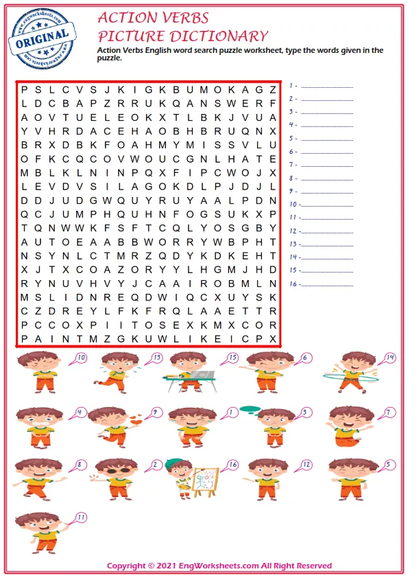 The words to be written under the pictures on our Action Verbs printable English worksheet are given in bulk at the top of our worksheet for kids. Write the words under the correct pictures, you can check what you wrote in the answer keys. On our Action Verbs vocabulary worksheet, you will understand how much you have learned the words and pictures you match in your memory.