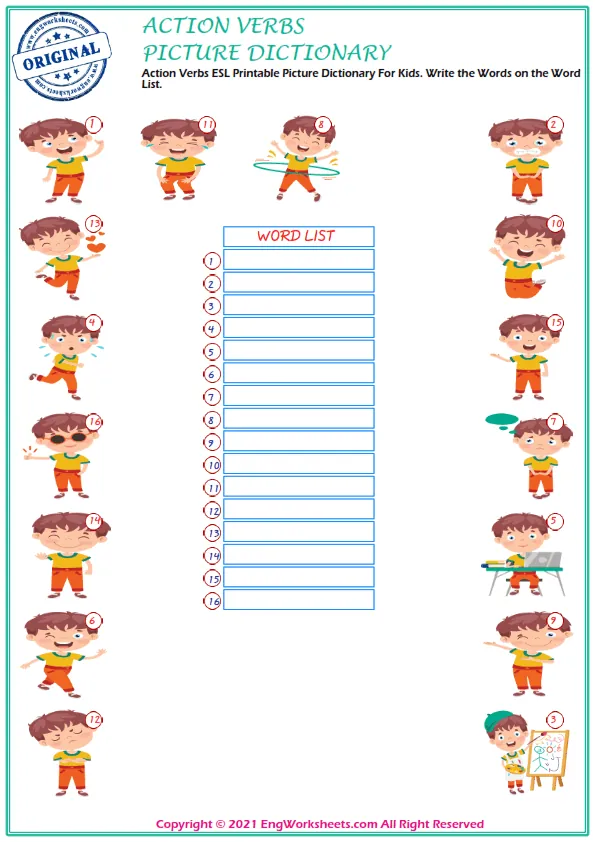 Action Verbs English Printable Picture Dictionary Worksheet For Kids