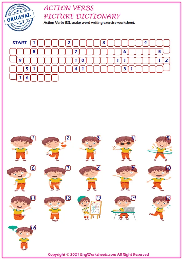 Our Action Verbs English worksheet with a snake-shaped design for kids. From the starting point, you need to write the Action Verbs words according to the numbers of the pictures below. An activity that will give you the habit of writing correctly in English. Correct answers are given on the second page.