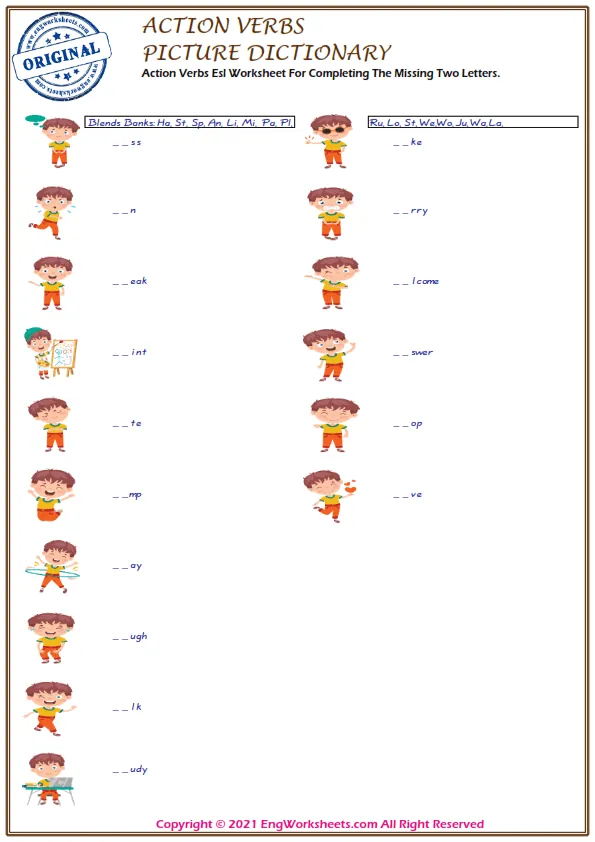 Action Verbs Esl Worksheet For Completing The Missing Two Letters.