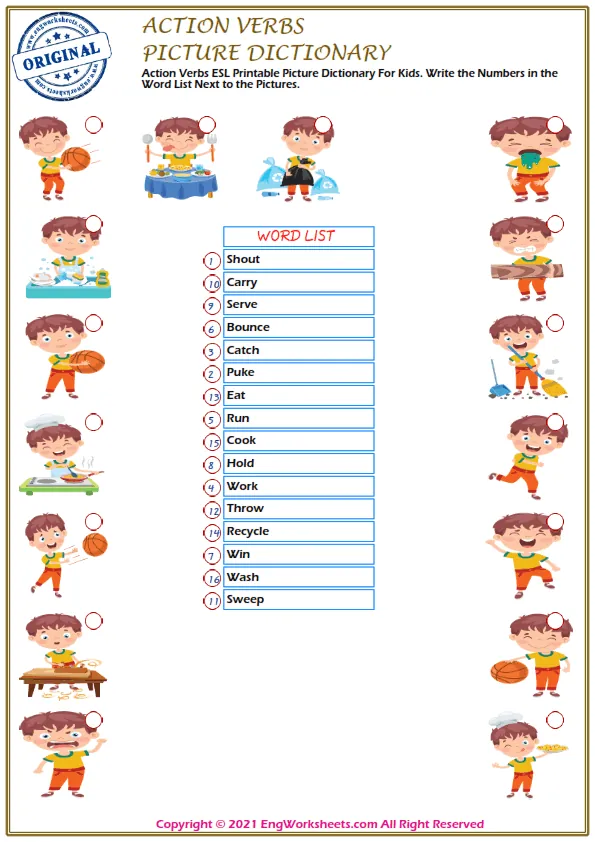 Action Verbs ESL Printable Picture Dictionary Worksheet For Kids