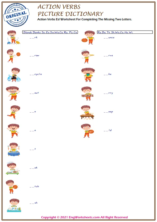 Action Verbs Esl Worksheet For Completing The Missing Two Letters.