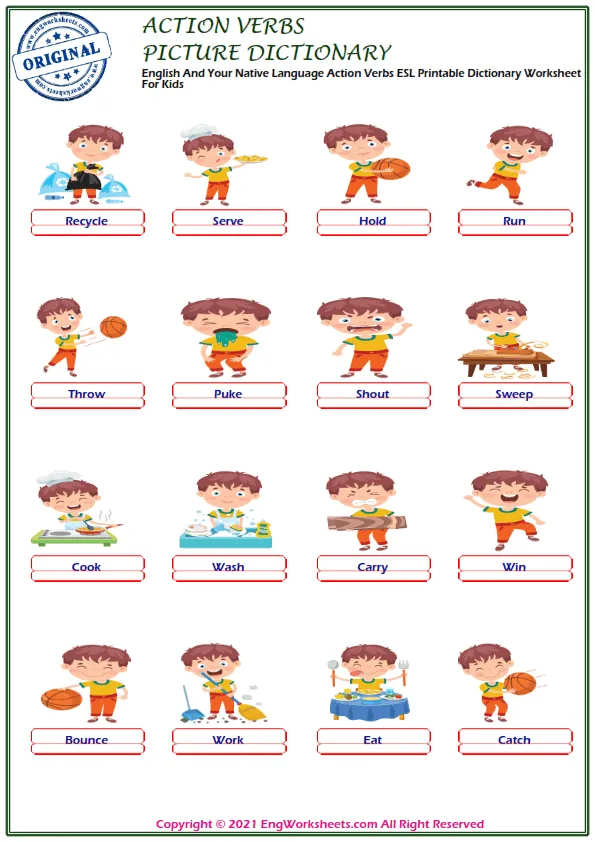 Action Verbs English Printable Picture Dictionary Worksheet For Kids