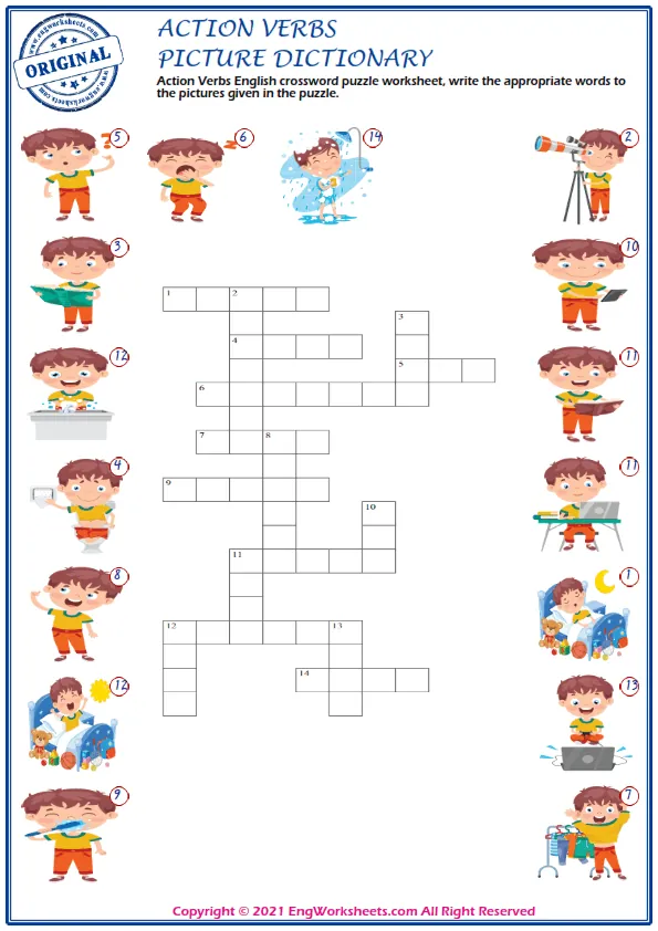 On our worksheet with a different design for kids. It allows you to check whether you learn correctly by writing the Action Verbs words you match with the pictures in the empty boxes. Our Action Verbs English worksheet is very good for vocabulary learning. Correct answers are given on the second page.