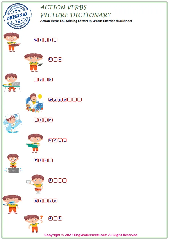 In our English worksheet for kids, the letters of the Action Verbs words letters are missing given. You must complete the missing letters and you will be able to check whether you have learned the correct English spelling of Action Verbs words. Learning Action Verbs vocabulary will become more fun for you and your students. Correct answers are given on the second page.