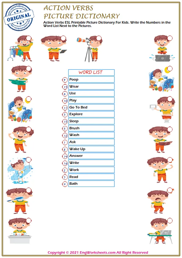 Action Verbs English Printable Picture Dictionary Worksheet For Kids